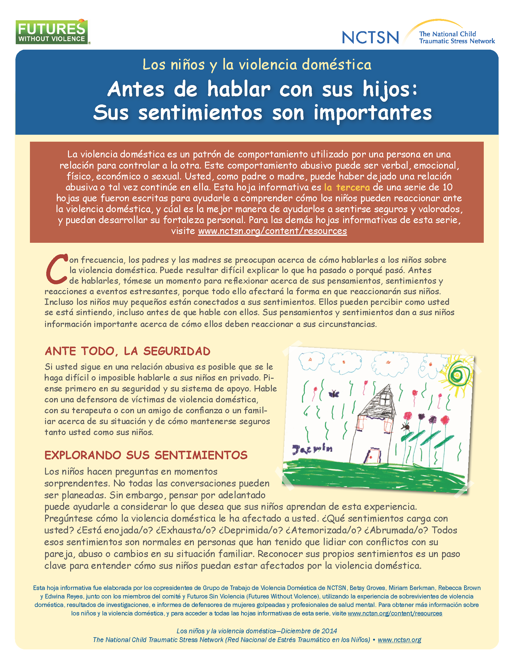 OfreceInformaciónpara los padres sobrecómohablar con losniñossobre violenciadoméstica。Esta Hoja Informativa Habla de la Importancia de Compercer Y Lidiar Con Los Sentimientos Aptios Antes de Hablar Con LosNiños。