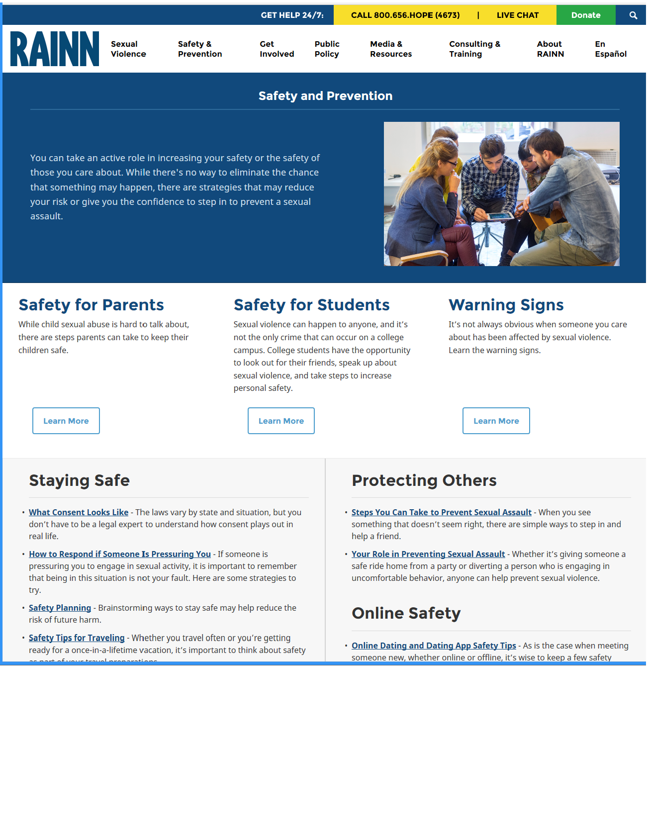 是全国最大的反性暴力组织。RAINN创建并运营了国家性侵犯热线(800.656)。HOPE, online.rainn.org y rainn.org/es)与全国1000多家当地性侵犯服务提供商合作,并为国防部运营了国防部安全热线。国际反性暴力组织还开展项目,防止性暴力,帮助幸存者,并确保将犯罪者绳之以法。
