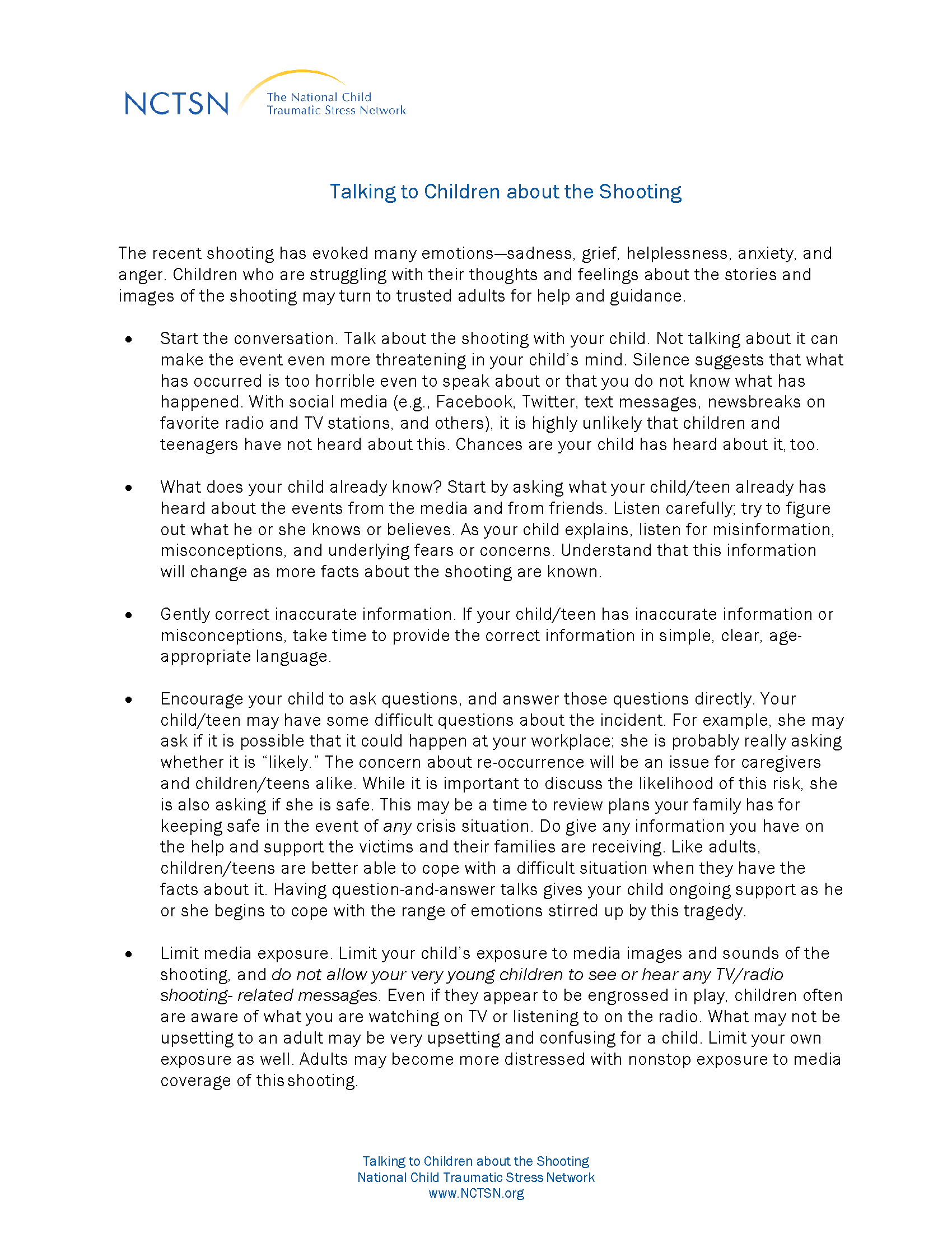提供如何与儿童谈论大规模枪击事件的信息。这张提示表描述了如何与儿童谈论涉及枪击的大规模暴力事件。它提供了如何开始对话的建议,孩子们可能有的常见反应,以及如果需要如何寻求帮助。