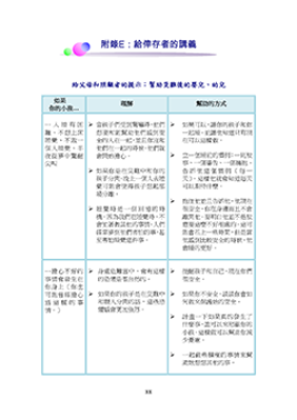 NCTSN资源 资源描述 是来自心理急救现场操作指南(PFA)。这份讲义向父母提供了灾难后的常见反应,应对这些反应的方法,以及你可以对你的婴儿或蹒跚学步的孩子说的话.这是中国版幫助嬰幼兒的家長提示 发表在2011 下载 打印版本