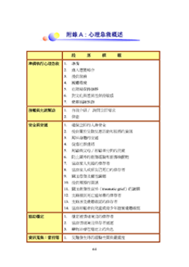 NCTSN资源 资源描述 这是本书的第一个附录心理急救现场操作指南(PFA)。本附录包括有关PFA概述、准备交付PFA的信息和讲义,以及每个核心行动的简要介绍。这是中文版心理急救現場操作手冊附錄A. 发表于2011 下载 打印机友好版