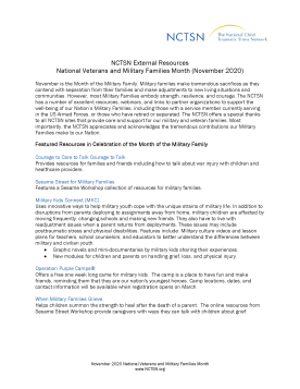 提供关于正在为失去亲人而悲痛的军人儿童的信息。这份提示手册描述了军人儿童如何应对创伤和悲伤,以及教育工作者和学校工作人员可以做些什么来帮助他们。