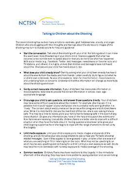 提供如何与儿童谈论大规模枪击事件的信息。这份提示文件描述了与儿童谈论涉及枪击的大规模暴力事件的方法。它给出了如何开始谈话的技巧,孩子们可能会有的常见反应,以及在需要的时候如何寻求帮助。