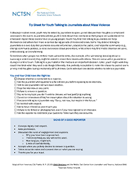 为青少年、父母、照顾者和其他与青少年有关的工作人员提供关于在大规模暴力事件后与媒体对话的指导。这份简报详细说明了儿童或青少年在与媒体交谈时的权利,以及成为一名优秀记者的标志。